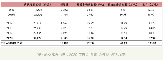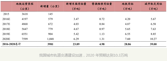 地铁:地铁占城市轨道交通比例 74% ,预期未来五年新建铝城市轨道交通用铝 23.9 万吨,车体大部件折旧替换约用铝约 5 万吨 。 根据以上粗略估计,预期未来五年城市轨道交通用铝需求到将达到39 万吨,2020年将达到 10.3 万吨。